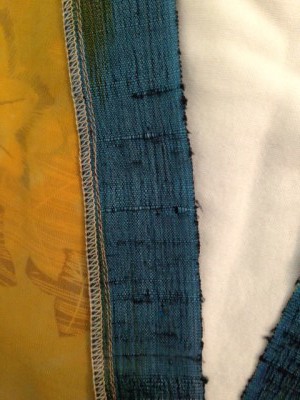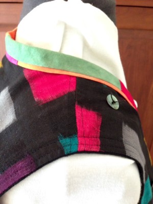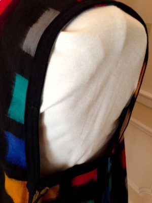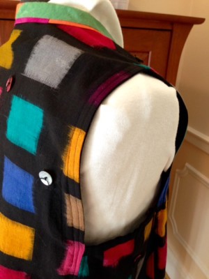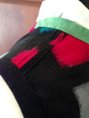 On the Ikat Squared Vest, the binding is completely turned under to the inside of the garment. In this sample I used two rows of topstitching to secure the binding to the armhole.