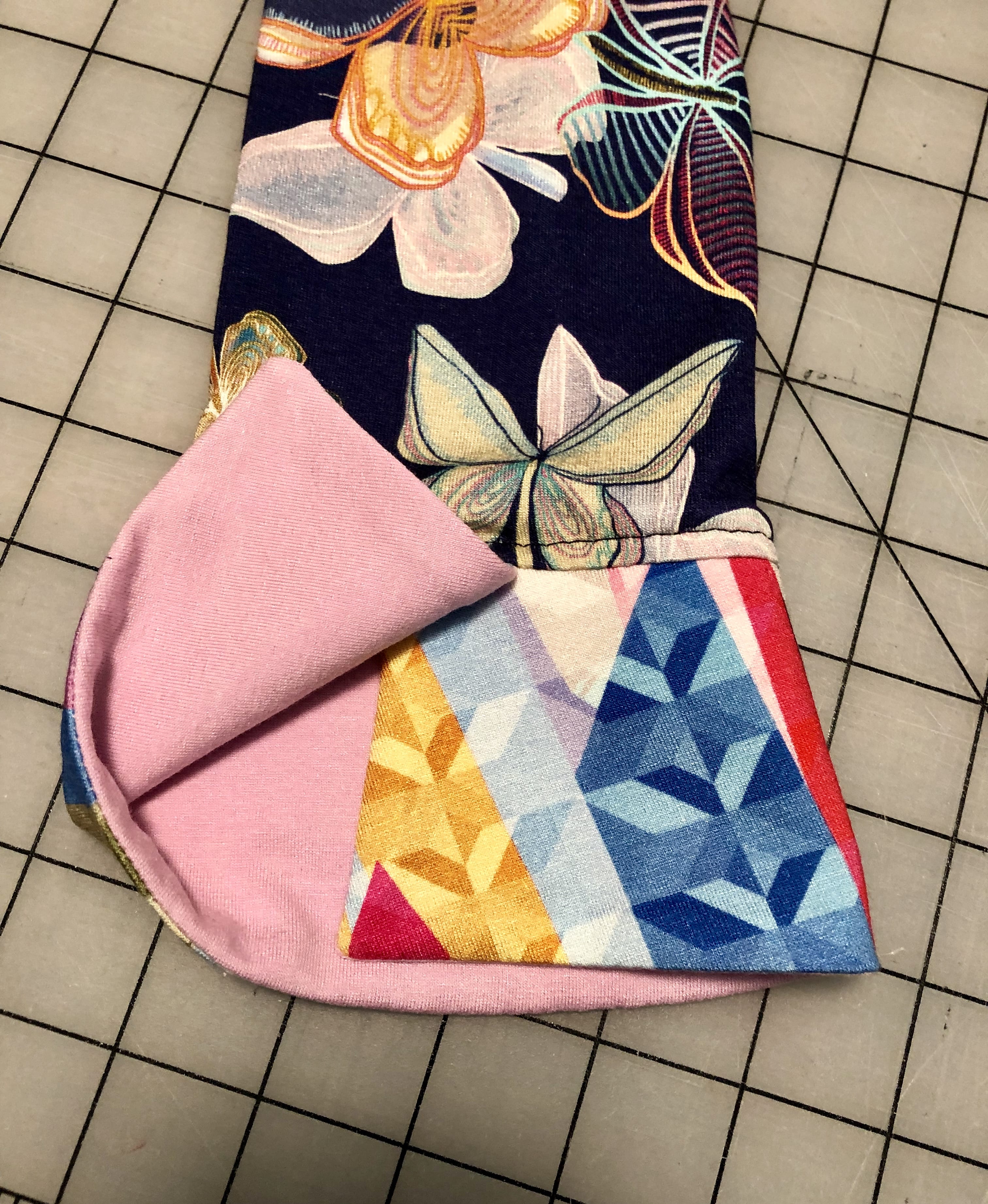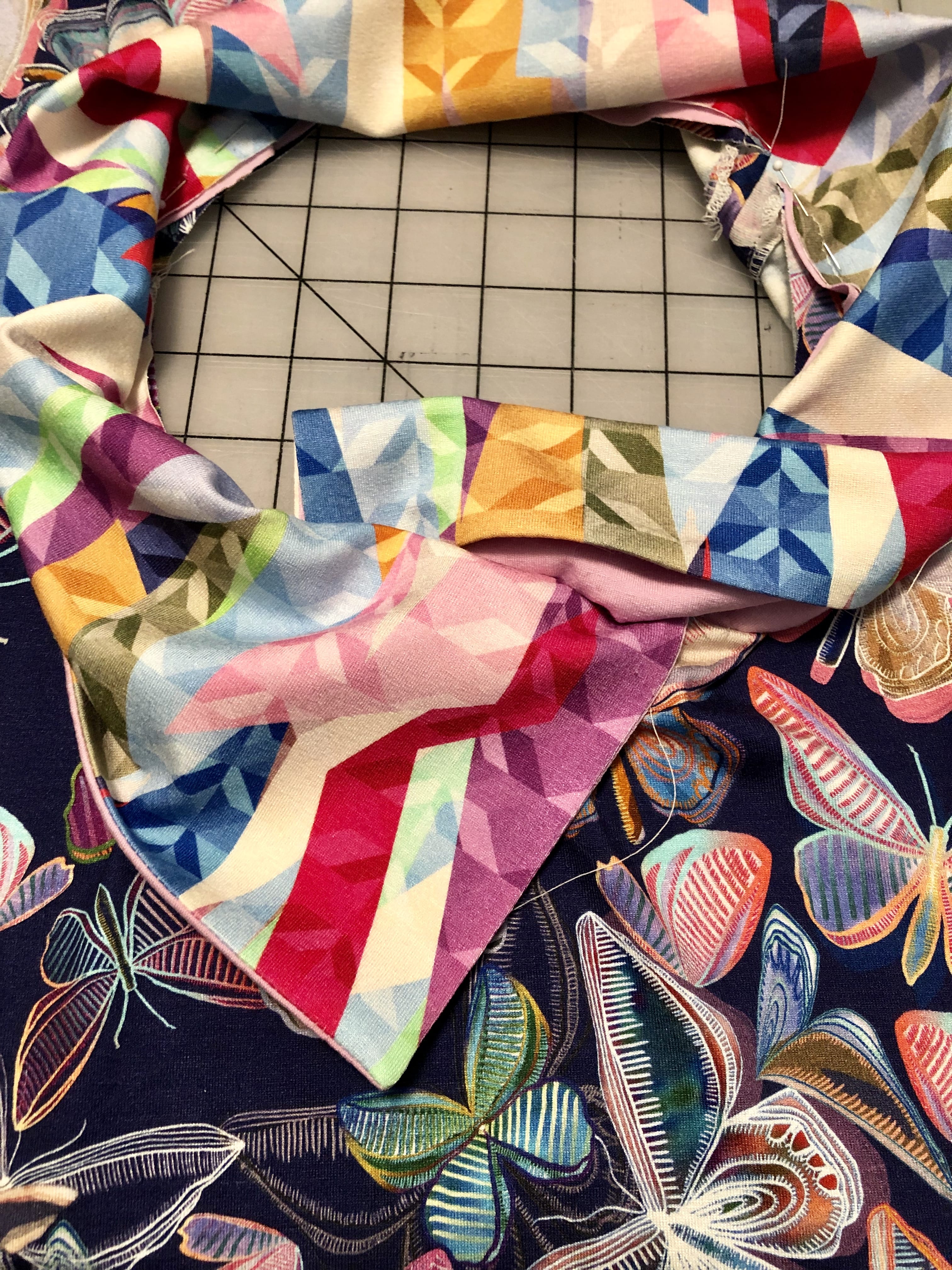 The body of my knit top started from Wide Neckline Variations for Tabula Rasa Knits. I chose the boat neckline, working straight off the pattern in the back but lowering the front by about 2″ to make room for the collar. I added the curved hem to make my top more of a tunic length and bound the curved hem with a binding in one of the contrast fabrics.