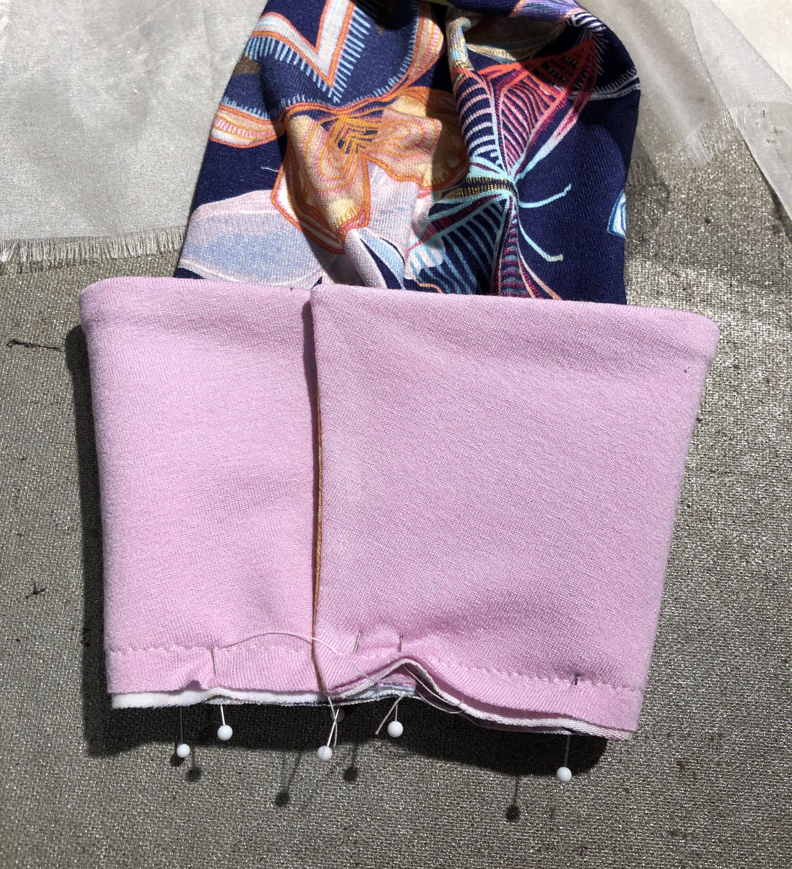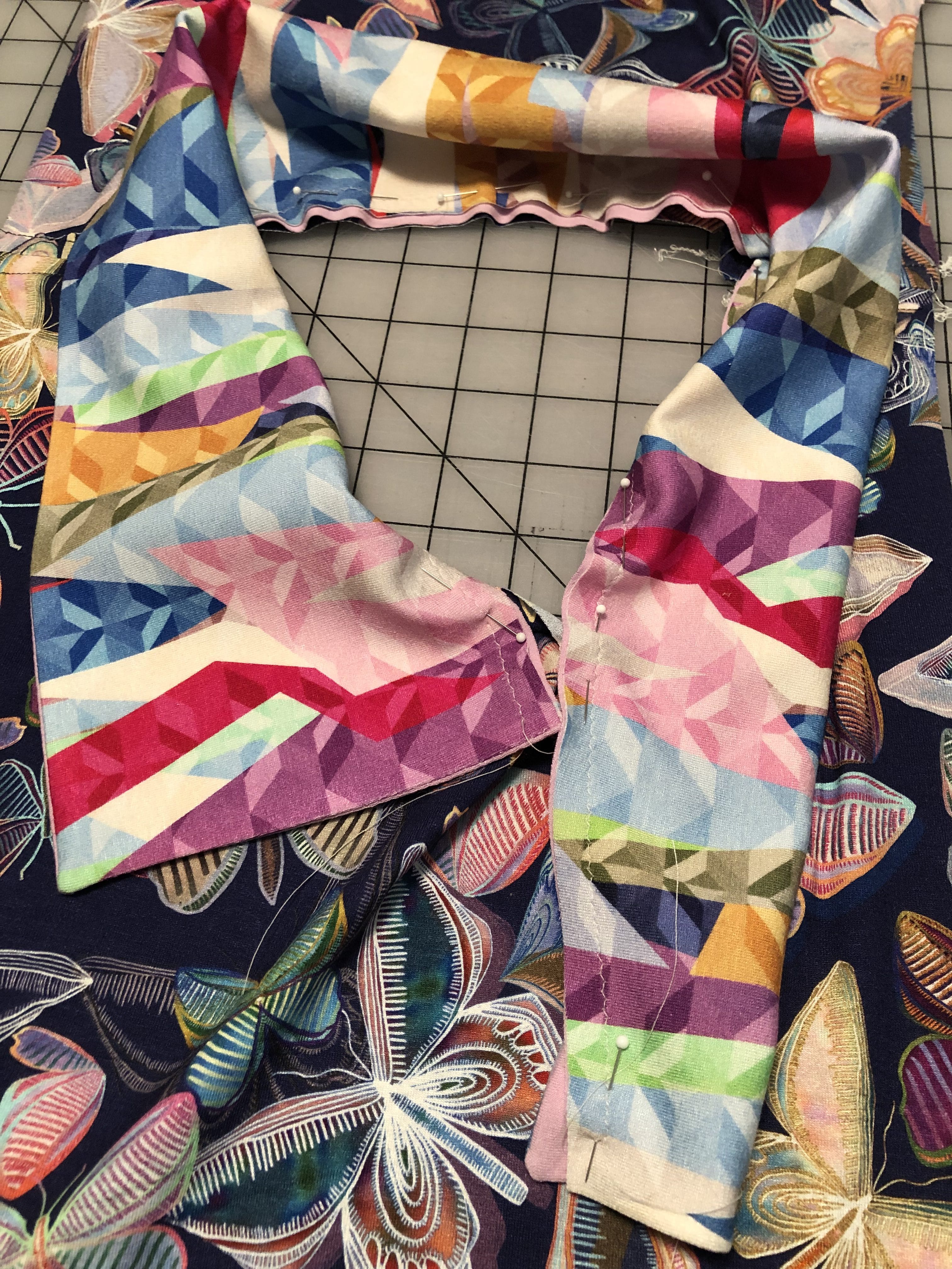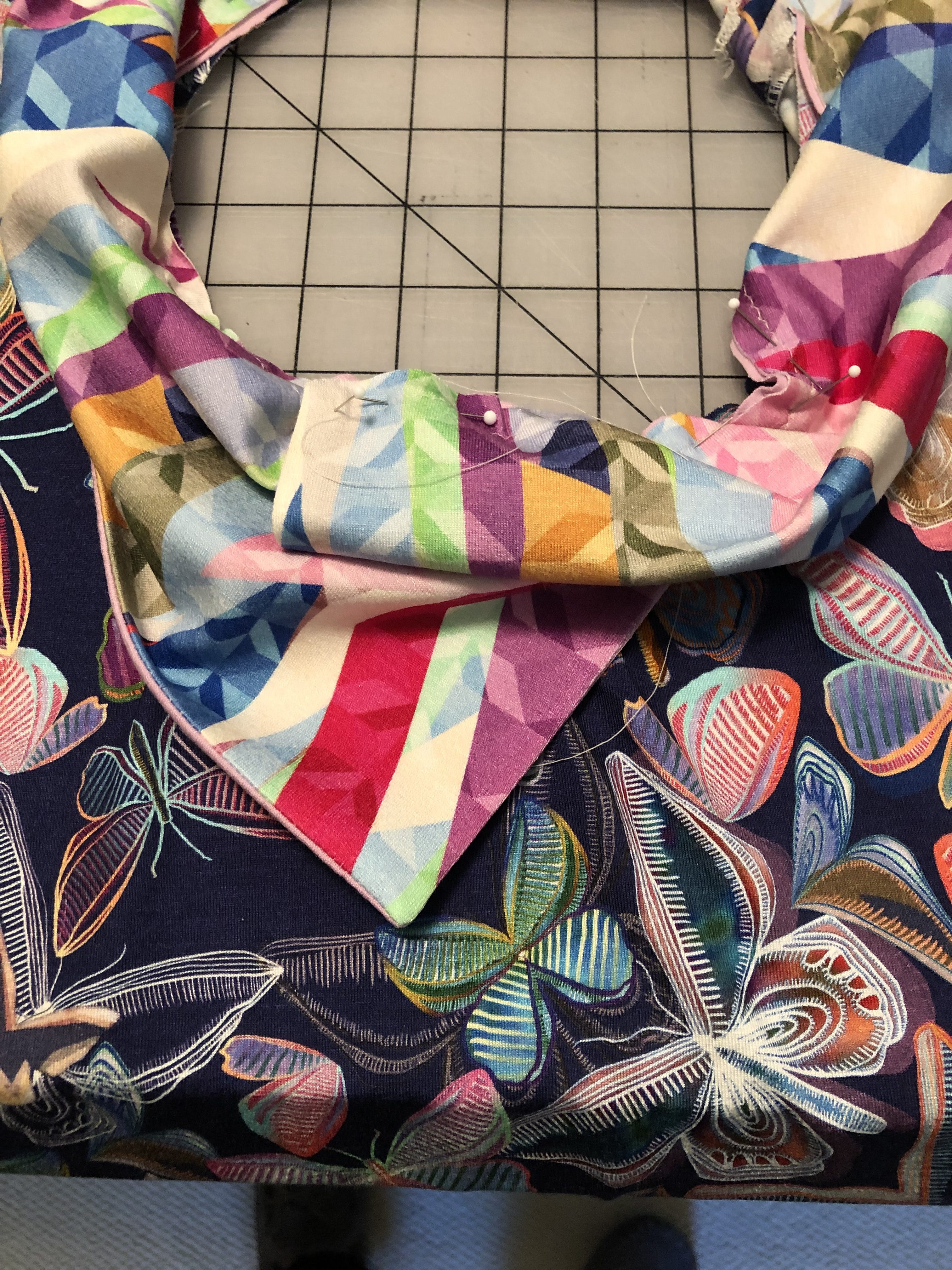 Figuring out how to position and wrap the collar required a lot of fiddling, so be sure to pin it in place and test it before sewing the collar to the top! I pinned one end of the collar at the front of the neck opening with the lining against the right side of the top, corner pointing down. Proceed to pin collar around the neck opening until reaching the point of overlap. Fold the loose end of the remaining collar down, lining side against itself and right side facing out. Pin this end of the collar into place on top of the outer end, making sure to catch the fold in the seam for 2-3”. Try it on, adjust as desired, then baste the collar into place so you can try it on one more time. I ended up cutting the inside end of the collar an inch or so narrower to decrease the depth of the folded end.