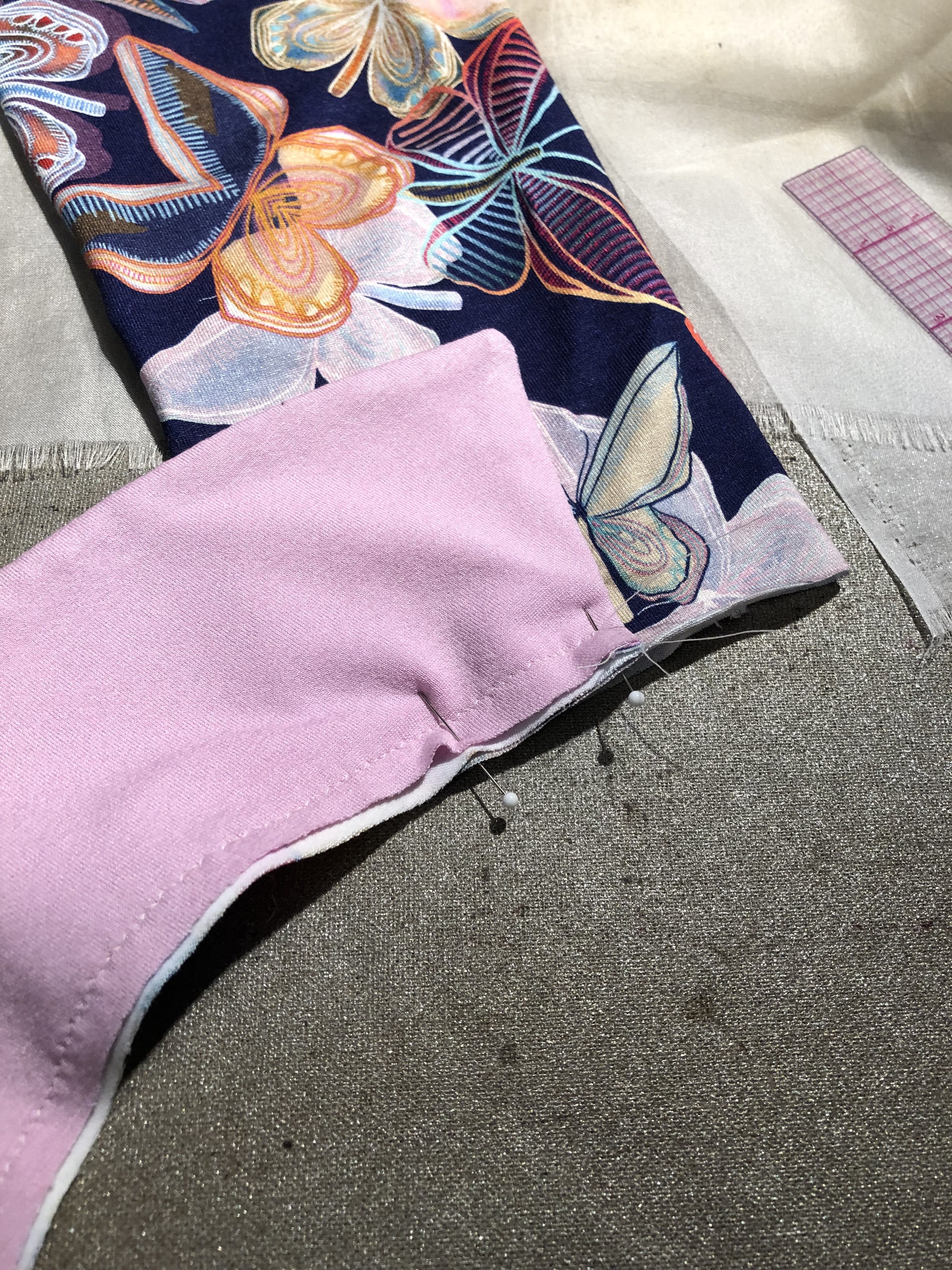 I wanted to mimic the style of the overlapping collar, so I adapted the Flared Cuff that is included in Wide Neckline Variations to create my overlapping lined cuff. This is an easy conversion. I added 1” to the length of the cuff pattern at the center to flatten the curve slightly. I cut one cuff and one lining for each sleeve and interfaced the lining for support. The cuff and lining were sewed right sides together around the three outer edges with a 1/4” seam allowance. Turn the cuff right side out and press it flat.