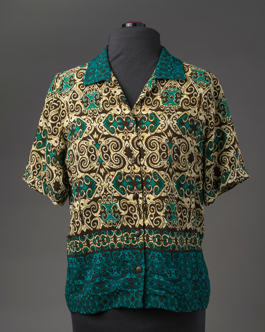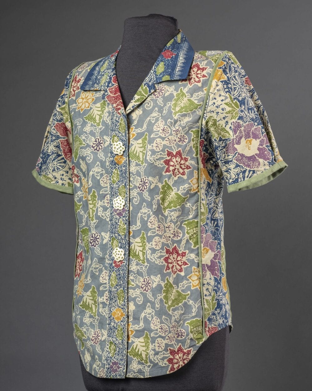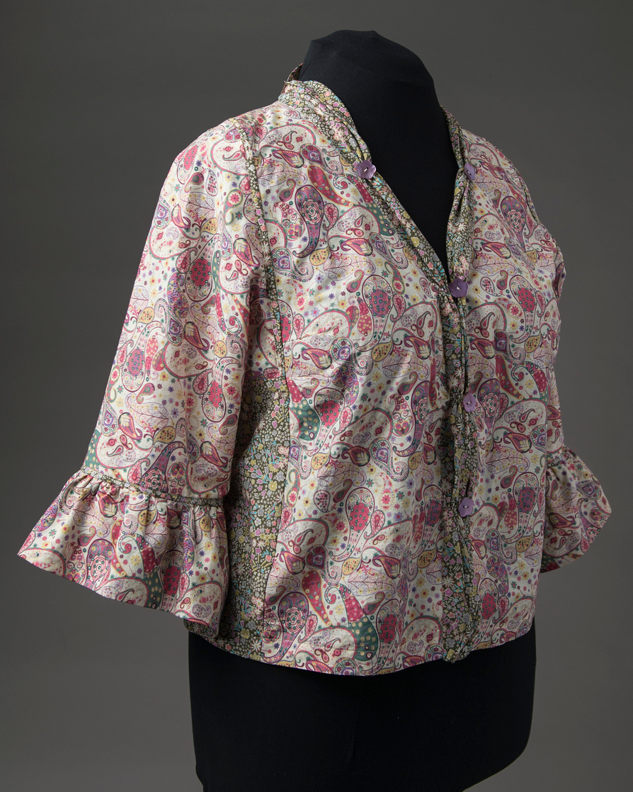 Rae’s paisley lawn Liberty of London blouse features a ruched band variation in Hot Summer Sewing. Carrie’s Malaysian Batik Shirt features a shirttail hem and short sleeves with a reverse pleat. Carrie’s Meadow Green Shirt features a faced split hem, collar, cuffs, and buttons all in the coordinating Liberty cotton print.