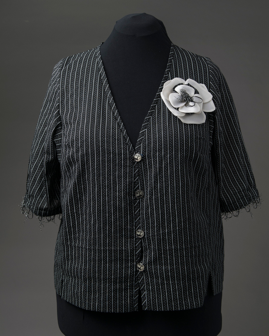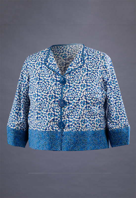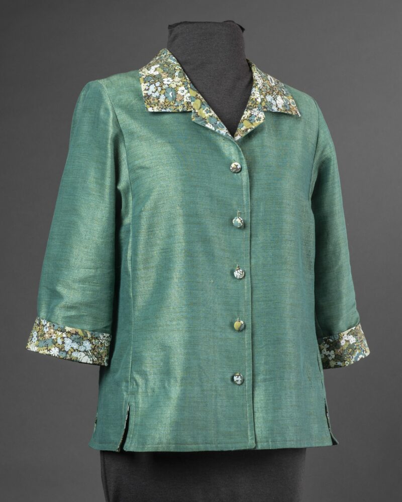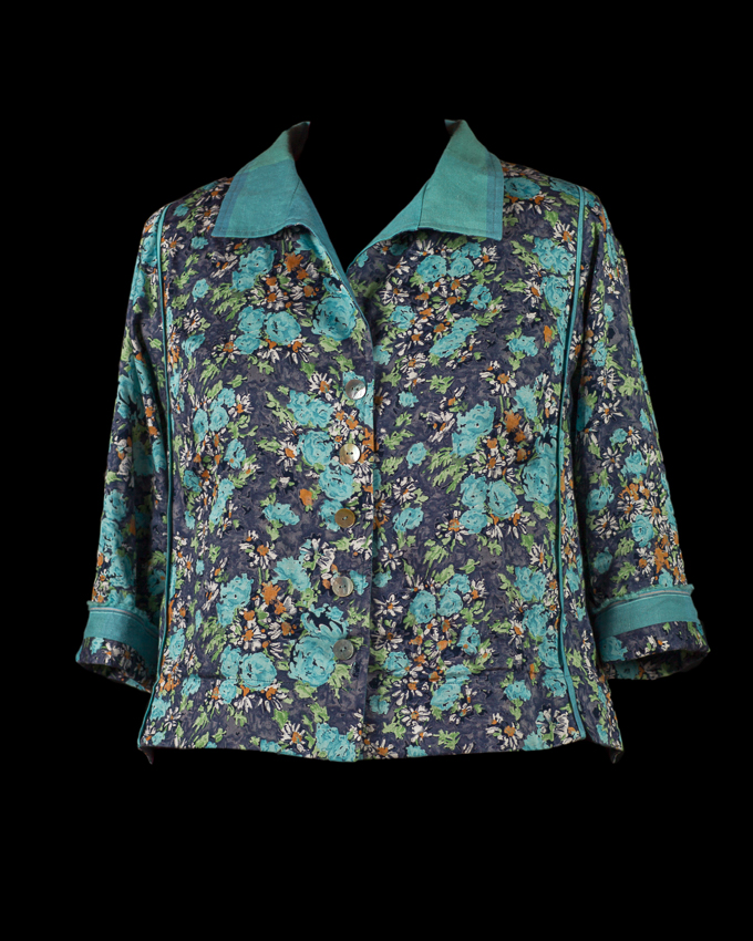 The jewel neck version of Rain or Shine Variations for the Tabula Rasa Jacket is also a great source for light summer tops. Carrie’s Tropical Birds & Flowers top made from a batik sarong features the curved jewel neckline with piping and buttonhole loops. Rae describes her lovely light blue and white Liberty of London cotton blouse featuring a banded hem and lantern sleeves in Curved Jewel Neckline. Rae’s Black and White Voile blouse features elbow length sleeves with a delicate trim and an organza rose.