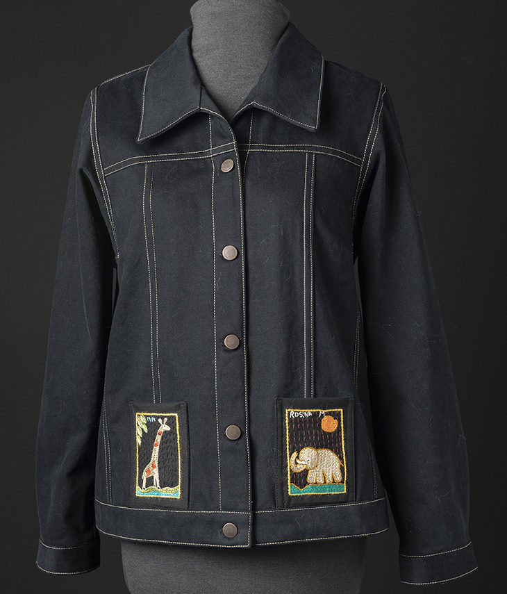 Developing a new pattern always requires a bit of trial and error! Carrie’s first Classic Jean Jacket sample features a very traditional jean jacket look with contrast top stitching, front breast pockets and flaps, classic collar and straight cuff, hem band, and jean tack buttons. On a closer examination, you’ll discover that she used the original TRJ Sleeve pattern, inserting a continuous bound placket to create the cuff opening. Her second sample, African Savannah Jean Jacket, includes the two-piece sleeve that is part of the final pattern package, contrast top stitching, and tries out front patch pockets instead of the breast pockets and flaps.