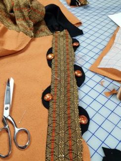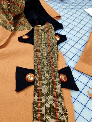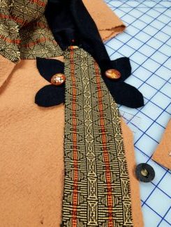 The person in question is Carrie and the project had been sitting on my shelf for at least 10 years. A lovely but small piece of handwoven fabric, 1 ½ yards of butterscotch washed wool and ½ yard of black washed wool double knit. It was a great combination of fabrics and textures, made even greater with the addition of 6 painted buttons that added a final flourish.