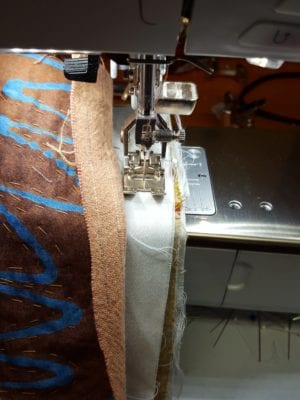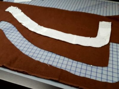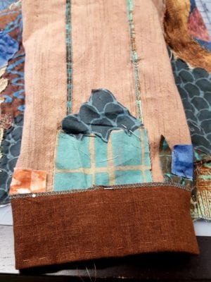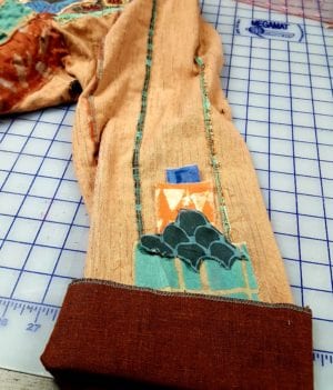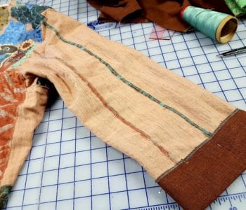 I had a large pre-washed piece of brown linen identified for the band finishes. Visit my quilting Ideas Pinterest page and see if you can find the two jackets that inspired the shaped bands. I created the band pattern last week and identified the serger stitch that I wanted to use to finish the band’s raw edges.
