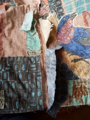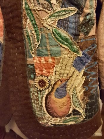 Read more about the fabrics used in the 2015 Sew! Let’s Get Dressed post Quilted Jackets for Fall, and the collage placement in Coffee and Collage from spring 2019.