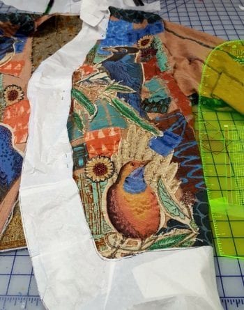 Sunday was scheduled to construct and apply the bands. It started smoothly, but soon slowed to a crawl when the loose weave of the curved linen band began stretching out of shape. Time to slow down and do this carefully. After testing some stabilizing techniques, I decided to fuse some narrow bias stay tape all around the band’s inside edge which was to be finished with the serger and then boro stitched to the jacket. Next, I hand basted the flannel filling to the underside of the shaped band to stabilize it before serging the raw edges.