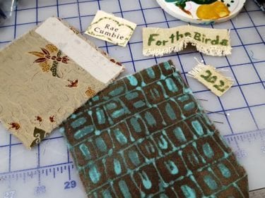The pocket is cut from one of the Marcie Derse fabrics, used in the patches,and a piece of the lining batik. I fused interfacing across the top of the lining fabric to support the top of the pocket. I also used our fluid textile paints to paint one of my labels and a name label for the jacket. I decided that the coat was in fact For the Birds, since the bird fabric was the inspiration for the entire coat.