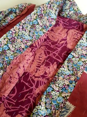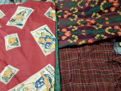 This jacket’s driver was my desire to use the rose-colored cotton lawn.  The print is so interesting: Polynesian postage stamps with images of Gauguin paintings.   Here are a few fabric combinations I considered.  My stash offered lots of possibilities.