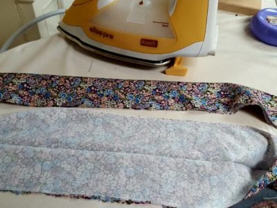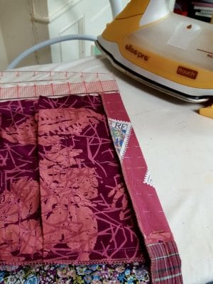 Here is a quick look at the process for cleanly finishing the band edges around the hem.  Your iron is your friend as you press the band finish in place first along the length and then along the band’s width.