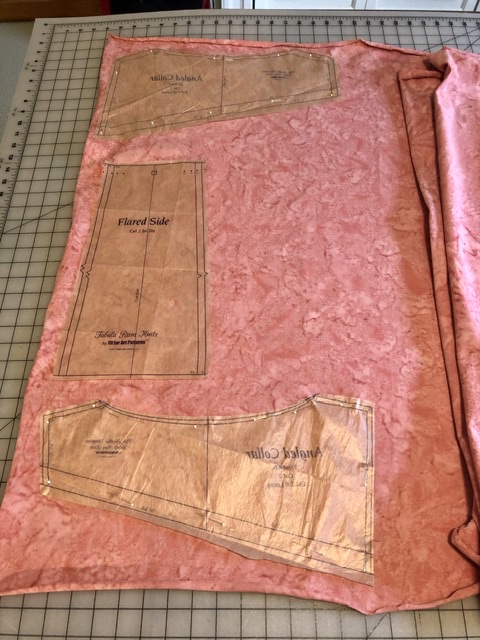 I cut the lower collar layer and side panels out of Coral Pink Spray and the upper collar layer out of Coral Pink Gardenista Vine.  When you are alternating the direction of the collars, be careful to turn the patterns over to cut the second set of front and back collars!  Here you can see me considering which layer to put on top.