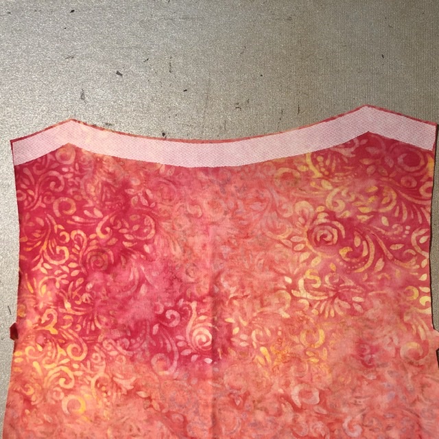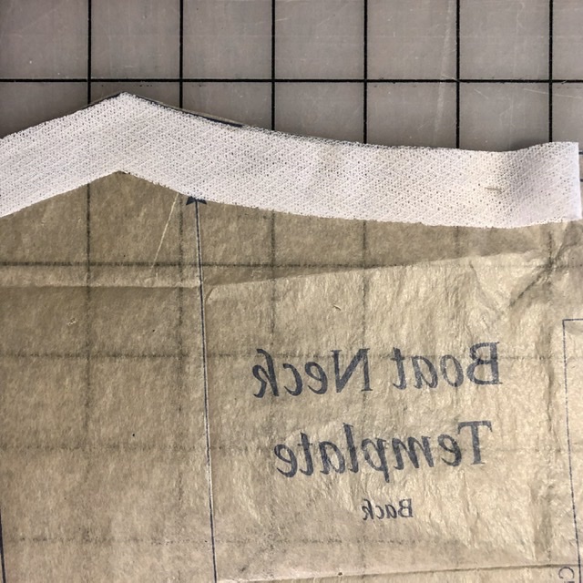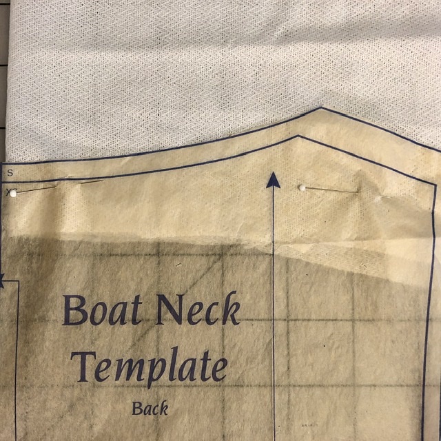 Before sewing the front and back together, I fused Soft Stretch interfacing along the front and back necklines. This provides stability for the collar and shoulders which bear the greatest weight and wear of the garment. Use the neckline edge of your templates to cut the interfacing.