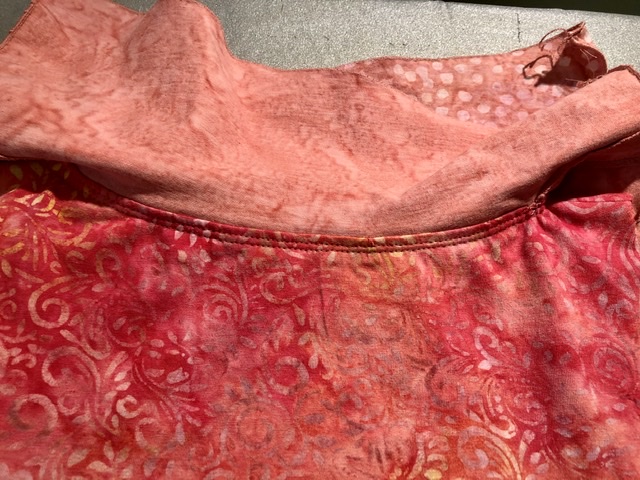 When it comes to adding Angled or Rounded Collars to the tee, there are choices – make it lined or unlined? If unlined, one or two layers? Stacked or in alternating directions? For this tee, I chose unlined, because the fabric looks almost the same on the wrong side as the right side. I chose two layers in alternating directions because I had these 3 great color coordinated fabrics to play with! Be inspired by samples of other styles of Wide Neckline Tees with collars in our Photo Gallery.