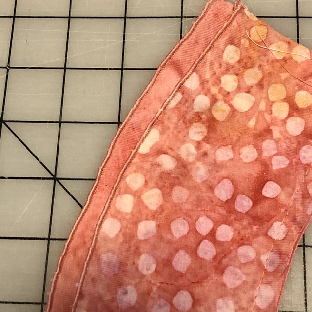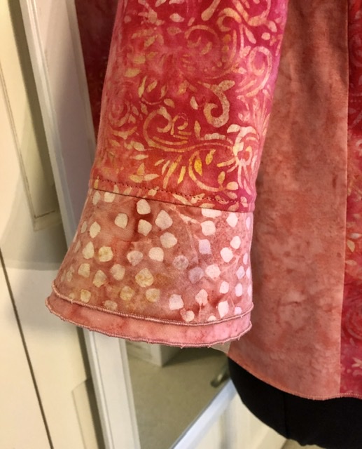 I cut one set of Flared Cuffs out of each coral pink fabric. After deciding which fabric would be the upper layer, I cut that pair of cuffs ½” shorter than the under layer. I finished the outer edges of all cuffs and the side seam with the same serger rolled hem as I used on the collars, and then basted the two layers together. Finally the cuffs were sewn to each sleeve, seam allowances pressed up and topstitched in place, just like the collars.