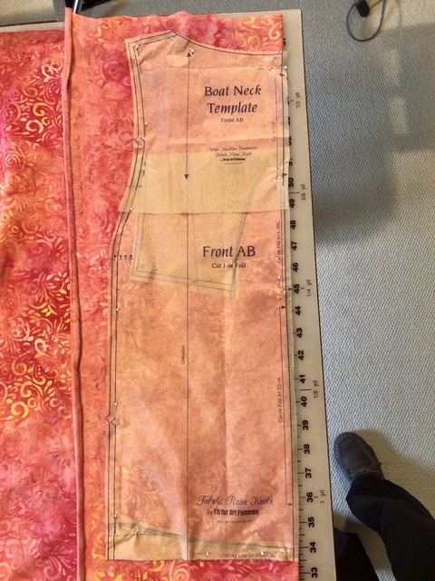 To fit the Angled Collar to the TRK Tee, we must modify the front and back necklines with the Boat Neck Templates. Here you can see on my layout that I pinned the appropriate templates, cut out in the same size as the tee, to the front and back patterns, lining up the grainline and armhole notches. Then I folded the core pattern neckline down and out of the way for cutting the pattern pieces. Alternatively, you can trace off your core front and back patterns and then tape the boat neck templates to the traced copies; this allows you to be ready to make the next wide neckline variation more quickly!