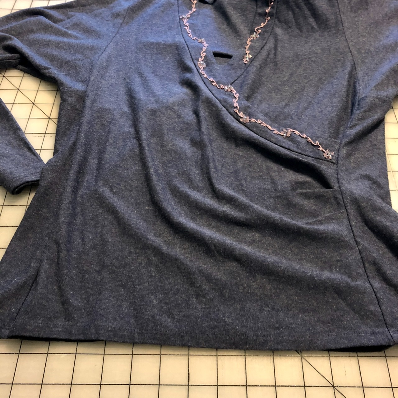 Even when you don’t pull the right front hem up shorter than the left front, you still have options for finishing the surplice. In some cases I turn both layers up and hem them together, as in this very lightweight slubby knit. Other times I still hem the fronts separately to allow the layers more movement, as with this blue heather surplice with a shaped band.