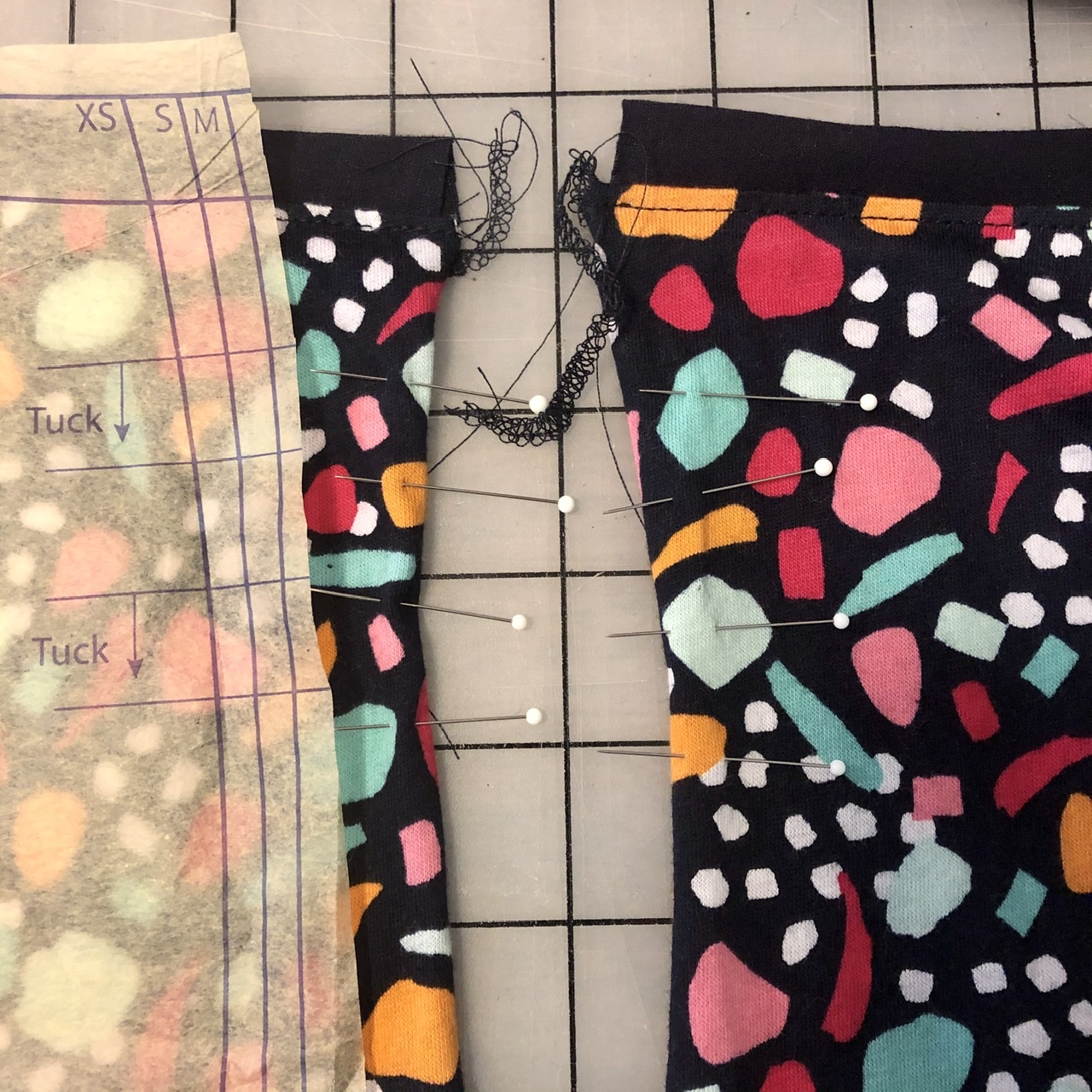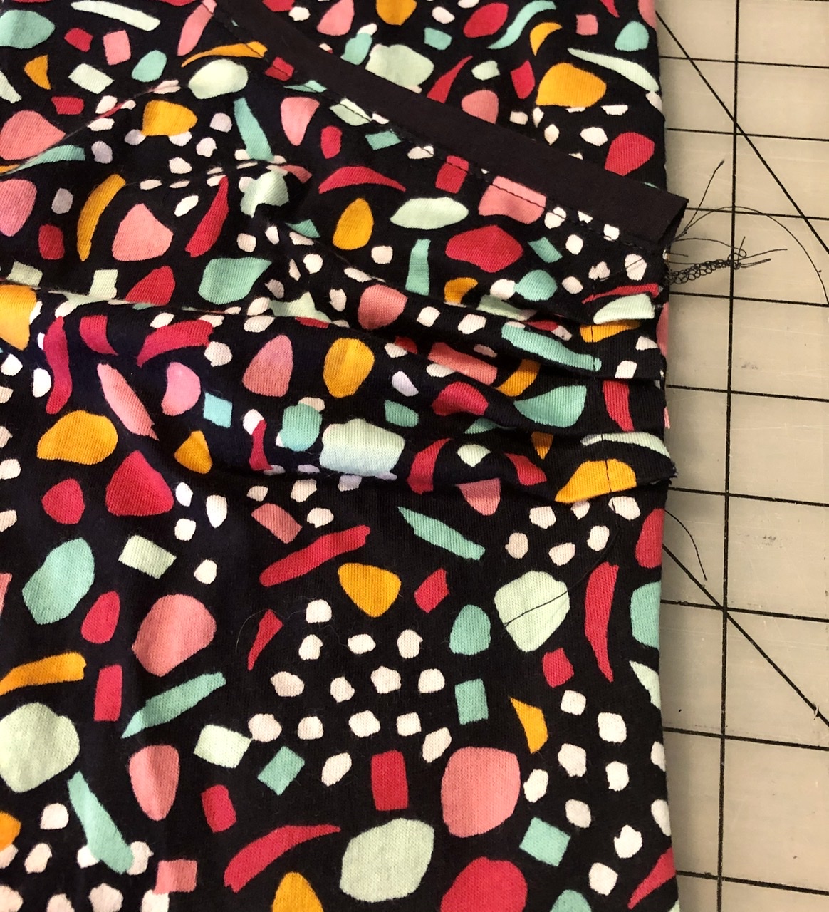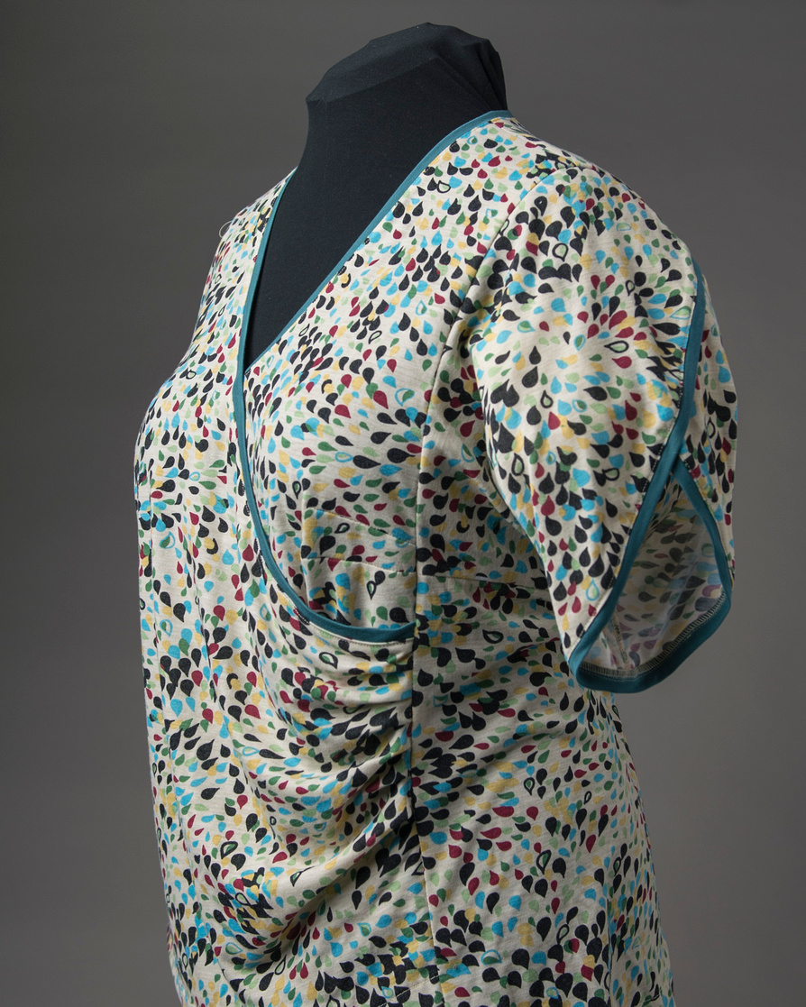 Second, the pleats along the front side seams can be used to adjust the fit and vary the hemline. I typically prefer to make the outer front surplice layer’s hem shorter by adding a few extra pleats. For my Confetti Surplice top, I decided to finish the hem with a band or binding, just like I used at the neckline, in order to frame the print with my solid rayon companion fabric. This option requires the right front binding to be applied to the hem before stacking the right and left fronts together.