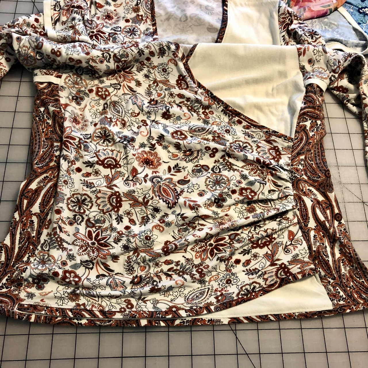 Finally, the right and left fronts are basted together along the side seams. I think you can see in this photo that I have trimmed the waistline of my surplice pattern by taking in the side seams of the fronts (as well as the back and side panels). The method described in Adjustments for a Trimmer Fitting TRJ works just as well for Tabula Rasa Knits. However, we advise making your first surplice on the pattern, then basting out the side seams to find the fit you like. Remember, also, that there can be vast differences among knit fabrics that will affect the fit!