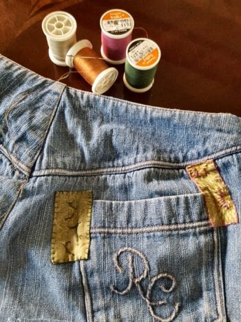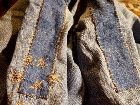 Two pairs, with very wide legs but sturdy fabric have been altered; one pair had a few worn places that I am patching using a different method than the boro patched jeans I wrote about in the previous post Tailoring Jeans.  It is a nice way to end the day, stitching by hand with little advance planning, the necessary patches to close up the holes and extend the life of the pants.  Sometimes I spend a few minutes looking at my Pinterest pages for inspiration before I start a new patch.