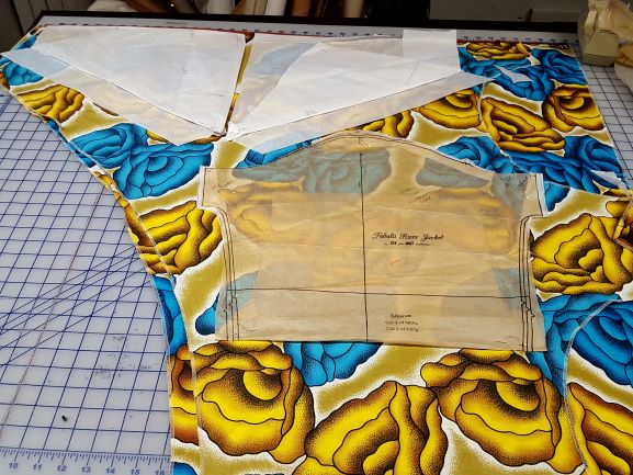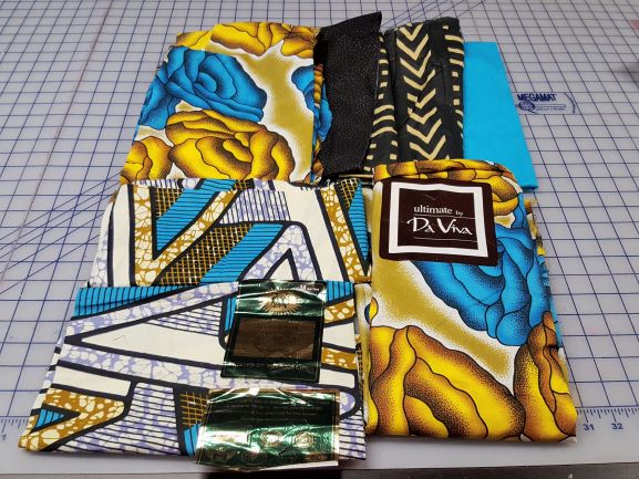 First, I had to do some reading about African Wax Cloth, remove their labels, coax away the sticky residue the labels left behind and pre wash the colorful fabrics. After some online research, I tested the fabrics for color fastness. A corner of each fabric was saturated with water, then pressed dry with a hot iron on top and a white cloth underneath. One of the fabrics did bleed when it was pressed. So, I washed it all by itself and also washed the red fabric by itself, since red often runs in my experience. All the fabrics came through the washing process beautifully but still a bit stiff so the design needed to be crisp, not drapey.