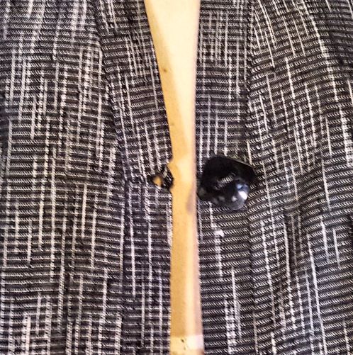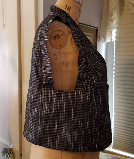 The project began with a 1 yard length of 38” wide fabric. The label said 40” but after it was pre-washed, it measured between 38 and 39”. The light weight tweedy silk handwoven came from the clearance basket at Mekong River Textiles. Initially we thought it would mix with other fabrics in our stash, but the greys and whites really did not look good with other fabrics on hand. A short vest seemed like an excellent default option. The vest directions for the Tabula Rasa Jacket pattern are a free download on our website.