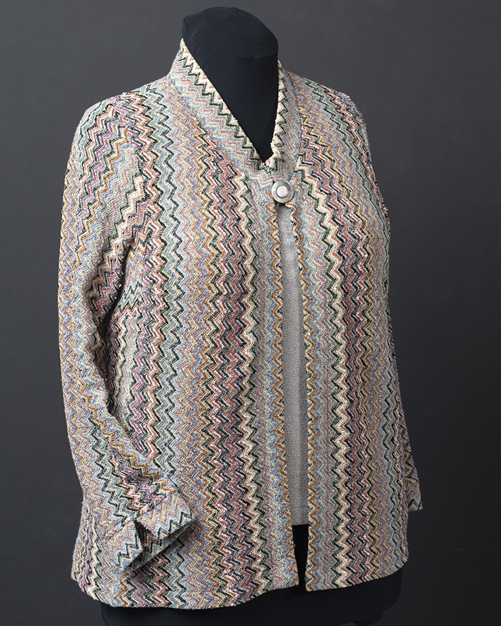 Circle Fun embellished Tailored Cardigan without a collar or cuffs shows the shape of the jewel neckline. For this sample, Rae finished the entire neckline, center front and hem with a continuous binding, and the sleeves were finished in the same way.