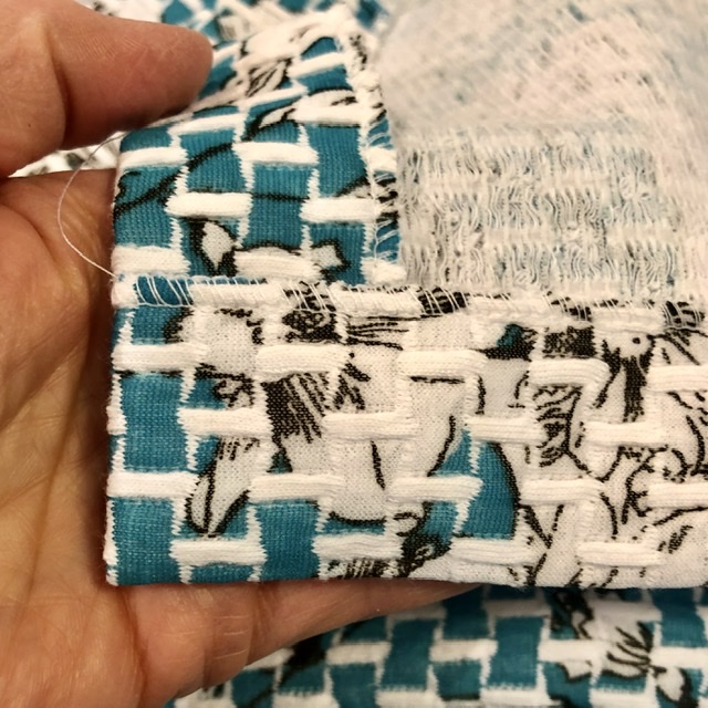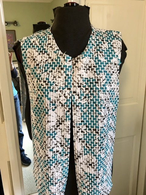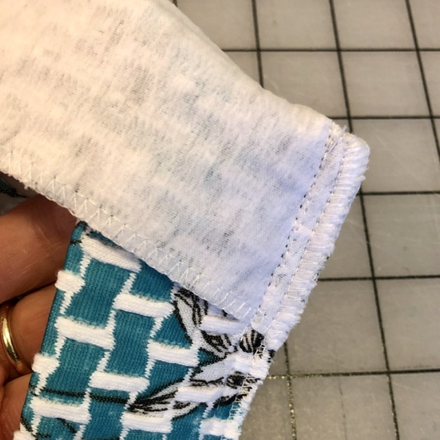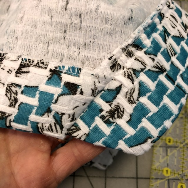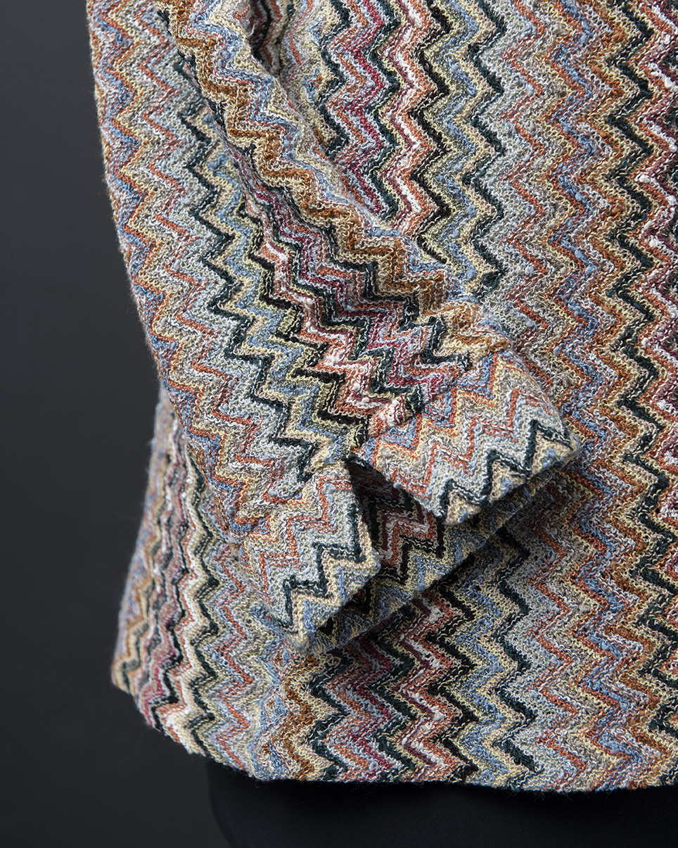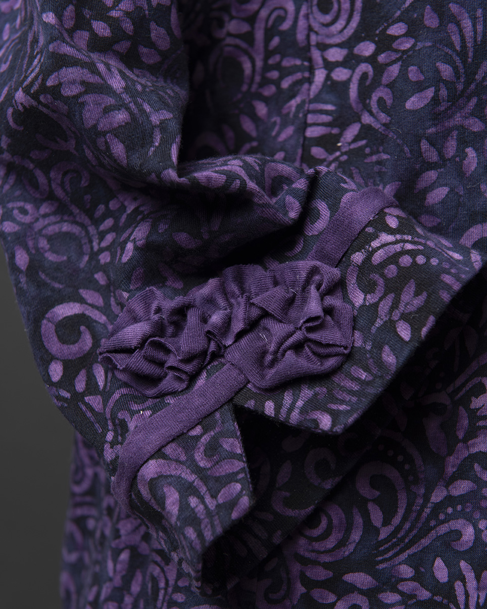 The Tailored Cardigan is best suited for relatively stable knits, in contrast to the Waterfall Cardigan which requires drapier knits. The Twin Set samples in the Photo Gallery will give you come ideas. The Flower Basket Tailored Cardigan and Circle Fun Tailored Cardigan seen above are made from stable cotton pique knits. Magic Purple Ruffles Twin Set is a cotton jersey knit from our friends at Sew Batik. Sweater knits are also a great option, such as the Wanna Be Missoni and Sparkly Tailored Cardigans. Ponté knits are also good candidates. (True confession, after making the Brushstroke Ponte Waterfall Cardigan, I realized that it would have been more suitable for a tailored cardigan.) However, if you have a softer knit that you want to make into a Tailored Cardigan, consider creative options, such as the double layer that Rae used in this Fabulous Fall Twin Set.