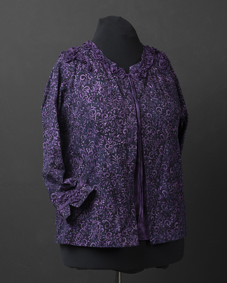 Because of the turned back facing, button loops have to be handsewn to the center front after it is finished. It can be hidden on the inside, like the sample below, or incorporated into an external embellishement. Closures that sit on the exterior of the garment, such as frogs or chinese knots, are also a great option.
