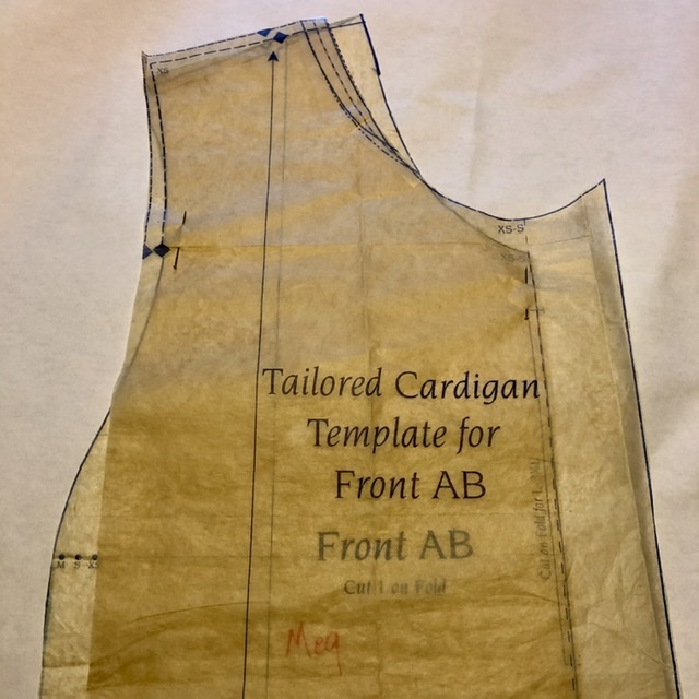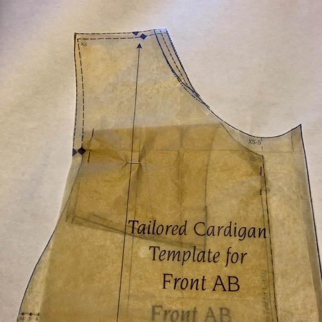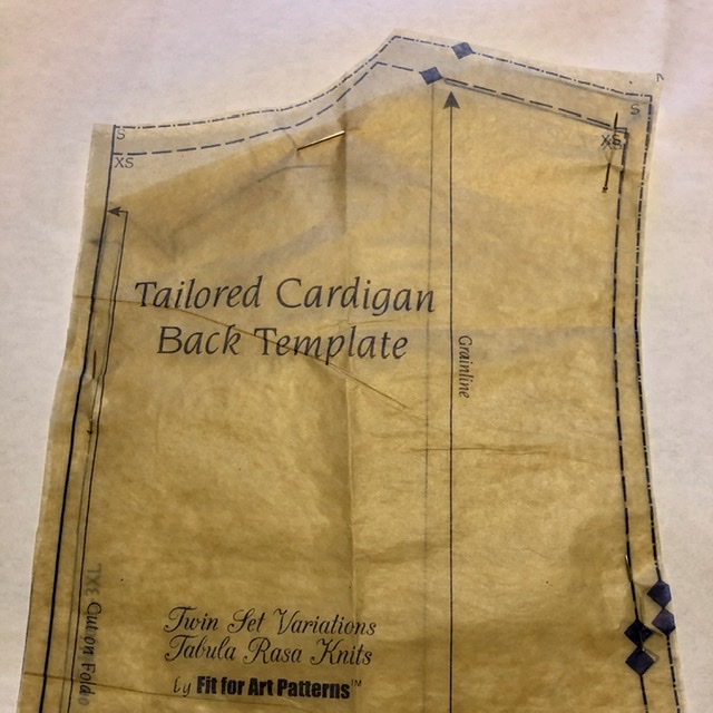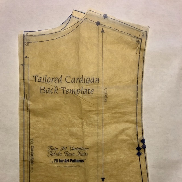 Like most of our variation patterns, the Tailored Cardigan requires you to make a few adjustments to your core Knit Tee pattern. Cut out the Templates for the Tailored Cardigan Back and Tailored Cardigan Front, in AB or CD as appropriate, in your size. Lay the template over your adjusted core pattern or a traced copy of it, lining up the shoulder line, armhole notches, center back for the back template or center front to the fold line on the front template, and pin or tape them together. As you can see below, the neckline of the Tailored Cardigan templates are narrower than the core pattern, so cut away the paper on your traced core pattern piece that sticks out from the template, or fold it down and pin it out of the way as I have in these photos.