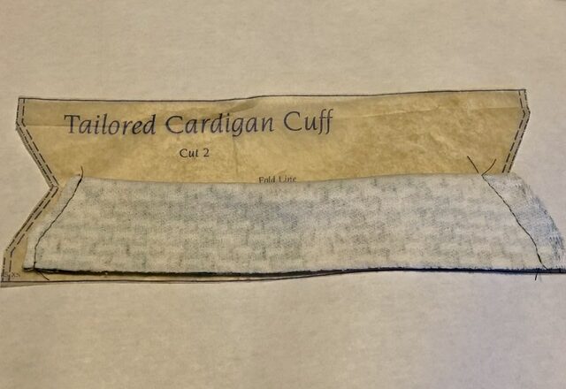 Basic construction of the body and sleeve/side unit are the same as the core Tabula Rasa Knit Tee. Turning to the special elements of the Tailored Cardigan, the collar is prepared in the same way as the cuff illustrated below. After interfacing the cut out pieces, fold the cuff or collar right sides together along the fold line. Sew the two short angled seams and clip the seam allowances. Turn cuff or collar out and press. It’s ready to be added to the cardigan!