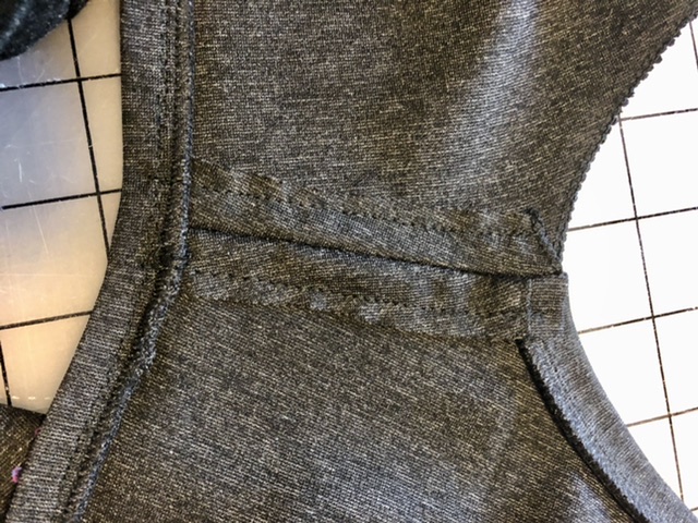 • Top stitched the shoulder seam allowances to secure at neckline and add support to the shoulders of the vest.