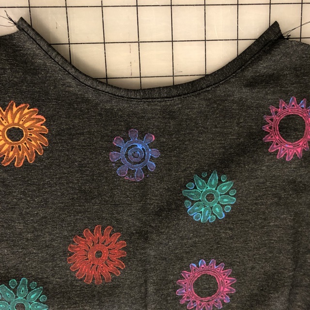 Vest painting was planned for a Saturday when Rae and I were visiting Artistic Artifacts in Alexandria, VA to do a live Facebook chat about Tabula Rasa Vests.  Artistic Artifacts has a big selection of hand carved wood blocks and textile paints that they were kind enough to let us play with.  To prepare, I cut the vest front, back and side pieces out of gray ponté knit and partially assembled the vest.  This involved finishing the underarm of the side panels and then attaching the sides to the fronts and backs, but not sewing the shoulder seams closed so the vest could lay flat for block painting.  You can also paint the pieces before assembly, but this gave me a surer sense of how the painted motifs would be arranged around the vest and prevented me from painting too close to a seam line.