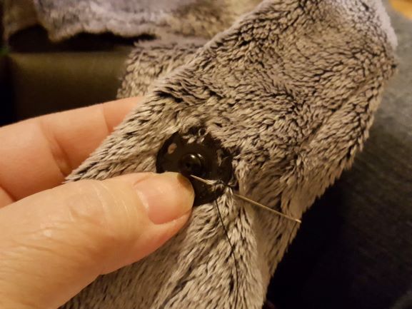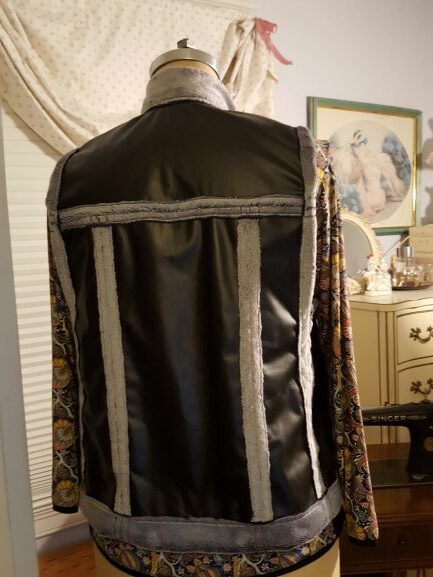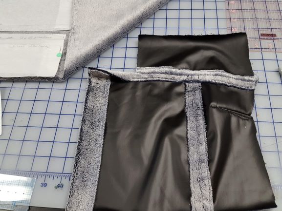 A quick trip to the fabric stash unearthed this very soft piece of faux fur/faux leather purchased at the JoAnn Fabrics winter clearance several years ago. There was only enough for a vest. It was not precious, but the black “leather” side was a very high contrast to the lt. grey/blue fur side. The bonus was that the seams could be left unfinished and topstitched open, allowing the grey “fur” to peak through the black “leather” showing off the fun seam lines of the jean jacket.