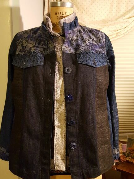 You might ask, what prompted this unexpected wardrobe addition? The stash fabric pile and the need for a jean jacket visual were the inspiration. Online teaching calls for high contrast visuals and we were scheduled to do an online presentation about Jeans Jackets early in January. The details of our black, grey and dark blue jackets were impossible to see clearly on the camera.
