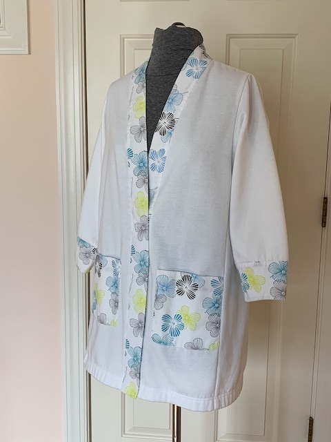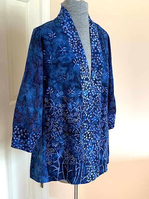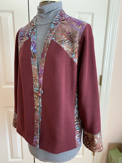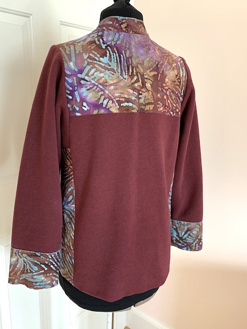 “I use the banded collar frequently. It is comfortable to wear and the width of the band can be adjusted depending on the style of garment I am making. I particularly like the Summer Sleeve with the Lantern Cuff and I am trying different sleeve and cuff combinations.” Val made the beautiful soft SewBatik rayon jacket during last December’s virtual Luscious Tabula Rasa retreat. Join us later this month for the Nifty Knit Tops virtual retreat for sewing time with Rae, Carrie and friends.