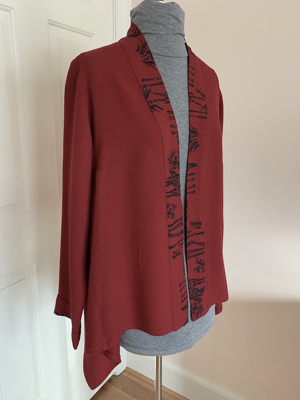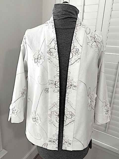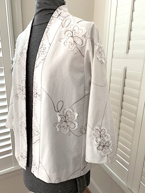 “The jacket pattern was easy to adjust for my fitting issues. I am of average height with a petite frame, narrow shoulders and long arms. Fitting through the shoulders has been challenging in the past but the TRJ fits me perfectly without any adjustment. The sleeve/side panel unit is unique in construction. It sews in smoothly resulting in a sleeve that looks terrific. After making just one garment, making other jackets including with variations, can be made with confidence that the basic fit will remain the same. This allows me to concentrate on showcasing fabrics as well as embellishment techniques. Clear directions and helpful hints in the pattern make the construction of the garment easy. With the many variations, I am only limited by my imagination.