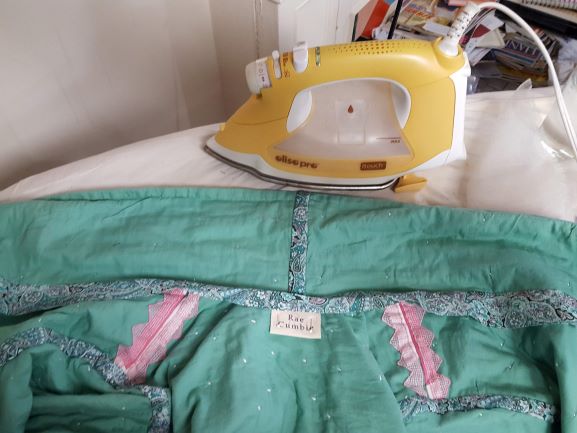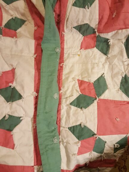 What made this quilt special was the contrasting spring colors, the matching green backing and the striped border with pieced corners. Two of the corners were faded and worn, but the other two well maintained corners were slated for the front openings.