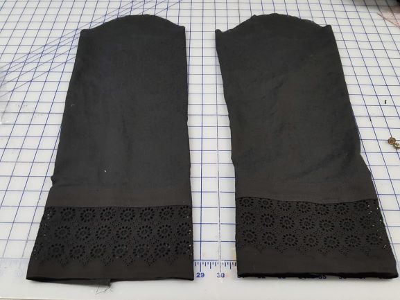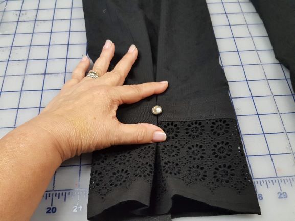 The fifth task was to check these design and button ideas using the pattern pieces to confirm there was enough of each remnant to create the design. Once the placement was confirmed, everything was cut. For this project I cut the main pieces and then used the leftovers to design the sleeve cuff. Fortunately, there was enough pique and eyelet to accent the sleeves and two extra buttons to shape the sleeve’s final flourish.