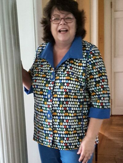 I love prints and color in my tops, shirts and jackets.  Designing such garments became easy when I found the square armhole configuration of our Tabula Rasa line of patterns.  My creations before my Tabula Rasa period were often solid- colored tops worn with colorful scares.