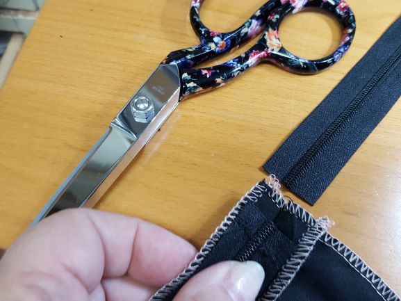 Set the machine to a zig zag stitch and stitch a line perpendicular to the zipper teeth to shorten the loose end of the zipper. Reverse stitch several times to anchor the zipper teeth. Trim away the extra zipper. Then stitch each zipper tab to each seam allowance to anchor the zipper thoroughly. Cut the zipper tab away from the seam allowances to minimize the bulk when finishing the pocket.