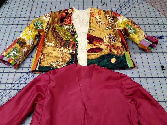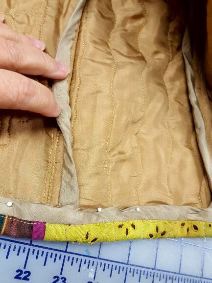 Constructed jacket and free hanging lining ready to insert Anna’s jacket with quilted in lining in process Binding the seams and hem before hand work. - Choose the batting or inside layer that will give loft and texture to the quilted jacket. Lightweight, drapey battings are very nice choices for jackets.