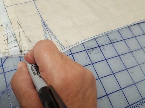 - Remove the pattern pieces and connect the clips or dots with a heavy marker line. This gives you a pellon piece with all the HBLs and the Grainlines drawn on.