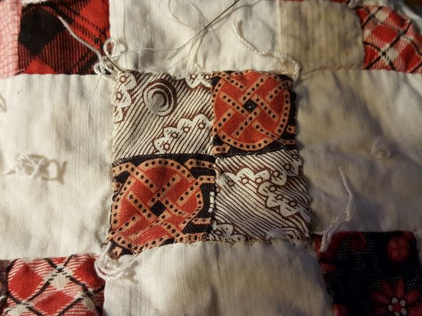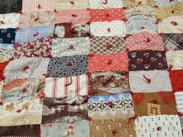 - Were these recycled fabrics already tired and worn when they were cut into the small pieces for the quilt’s assembly? Perhaps a special dress or apron?
