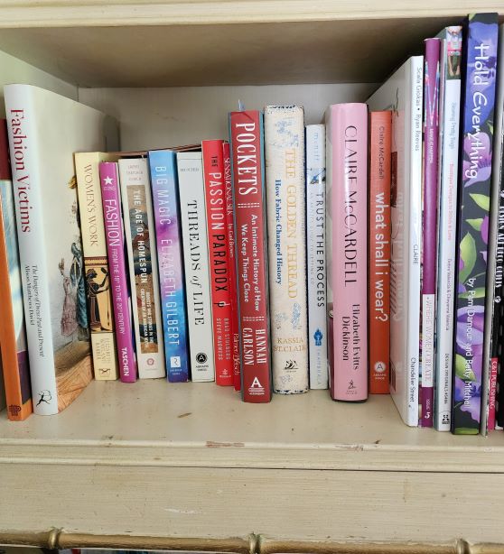 We will first consider the Claire McCardell biography by Elizabeth Evitts Dickenson.  It is a very engaging look at a fashion pioneer of the 20th century.  She has always piqued my interest because her archives are at the Maryland Center for History and Culture, and some of her work is featured in a small exhibit there.  Other books by and about McCardell were mentioned in the 2023 post, New Reads for the Fabric Lover’s Bookshelf.