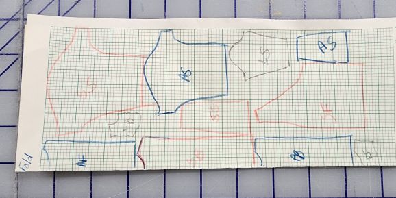 The patterns for each top were developed and adjusted where necessary. I rolled out the fabric and began placing the pattern pieces so there was as little waste as possible. I had a large TRK with Surplice front, a small/med wide neckline TRK, and a kid’s pattern based on the Peek-a-Boo pattern for the Penelope Dress. With larger sleeves placed alongside smaller body pieces, I was able to lay out a very tight fit on the fabric. I added another 2 inches for shrinkage, made a diagram of the successful cutting layout, then cut the yardage off the large piece, washed it, and hung it to dry.