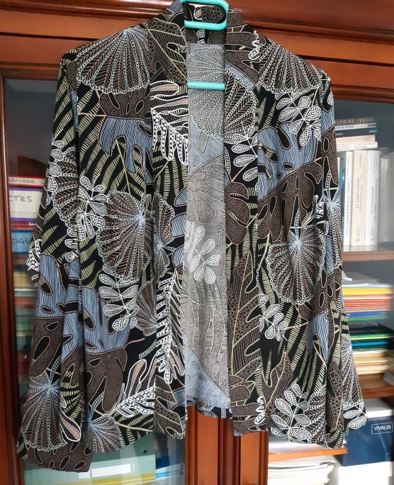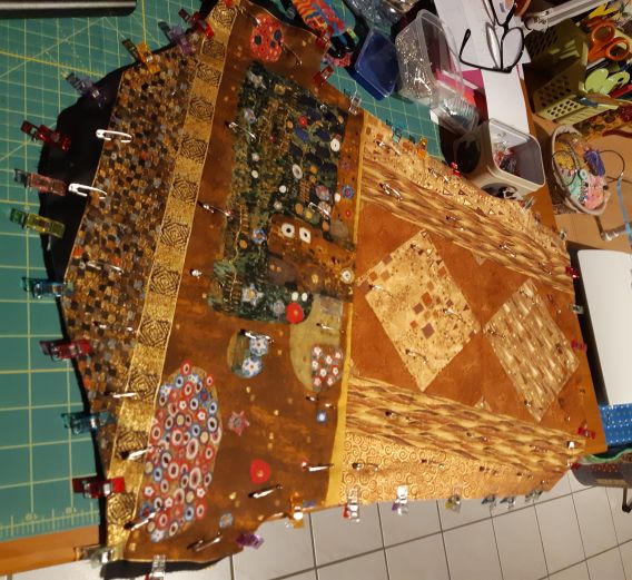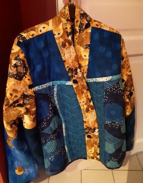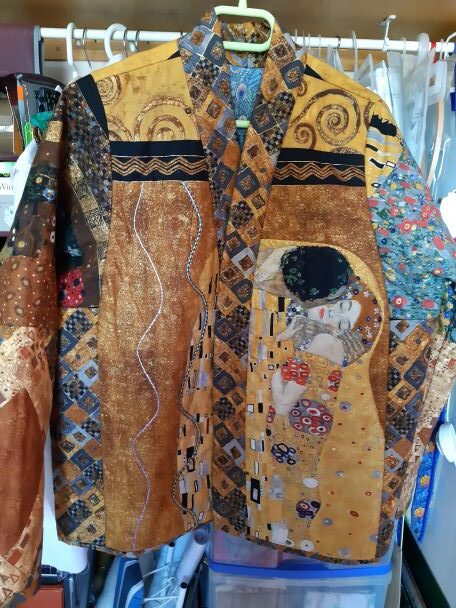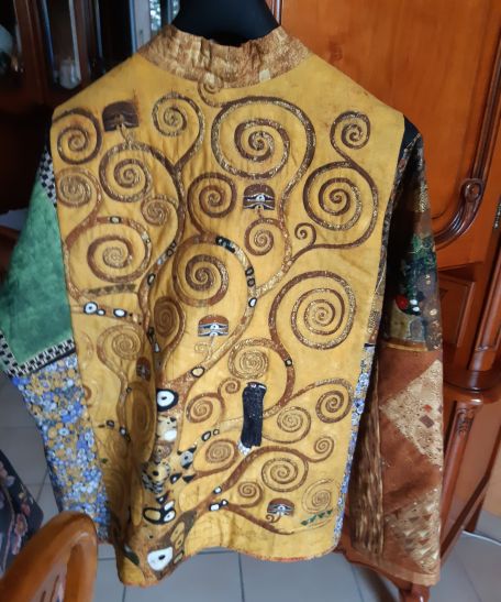 Some years ago, a french quilt shop offered fabrics on the theme of KLIMT (a painter I enjoy very much). I made 2 quilted jackets for my step-daughters and, as it’s easy, I offered quilted jackets to 2 friends of mine who seemed to like the ones I already made. I also made a jacket in sheer fabric, not lined, for summer, and now I’m going to make a new quilted jacket for me!”
