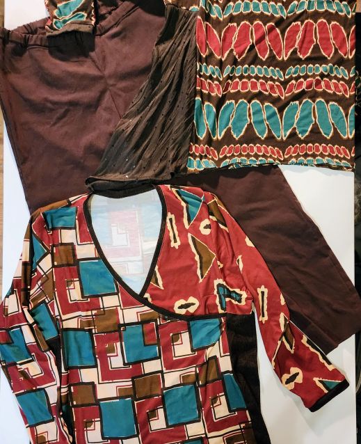 The knit fabric group became two Tabula Rasa Knit tops. One is a swing side tunic with ballet neck from Wide Neckline Variations. It’s a very reliable style in my wardrobe that works well on a print with strong horizontal lines. The second top became a surplice front Clever Crossing Variation, reminiscent of an old favorite in my wardrobe. It is a lot of print, but I hope to enjoy it along with these other new wardrobe additions as winter becomes spring.