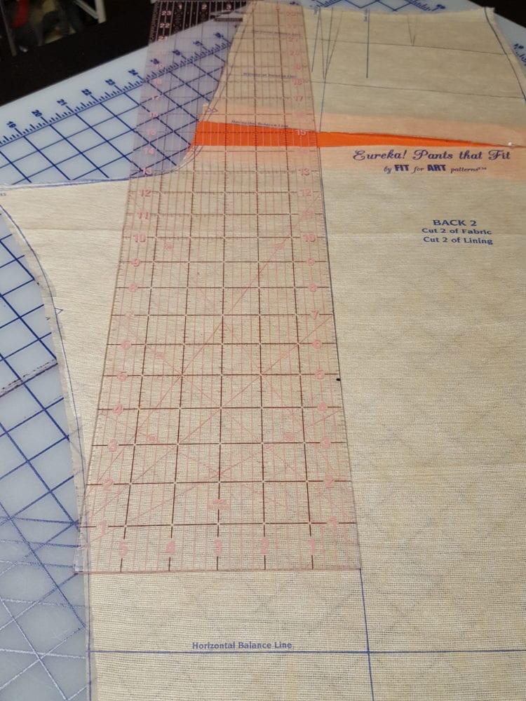 The “under the rear end wedge” is often suggested to reduce excess fabric below the derrière. As you can see from these photos, if you fold a wedge out of your pattern, you throw off not only the grainline, but also the inseam, the tilt of the waist and darts, the curve of the side seam and the angle of the crotch curve.