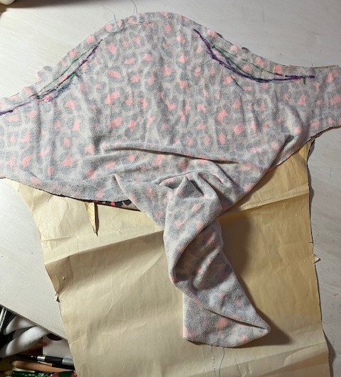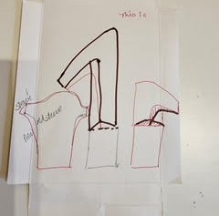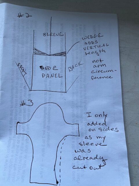 Andi’s original thoughts after reading the Common Fitting Adjustments for knit sleeves. She had reversed the side where the extra was added, which creates difficulty fitting the pieces together. Ultimately she used the method illustrated below.
