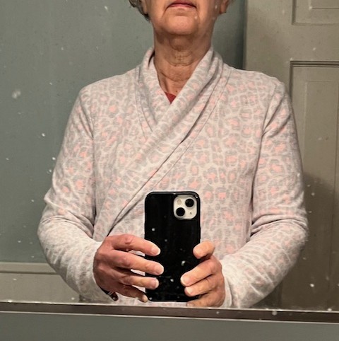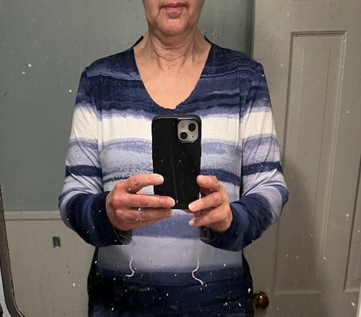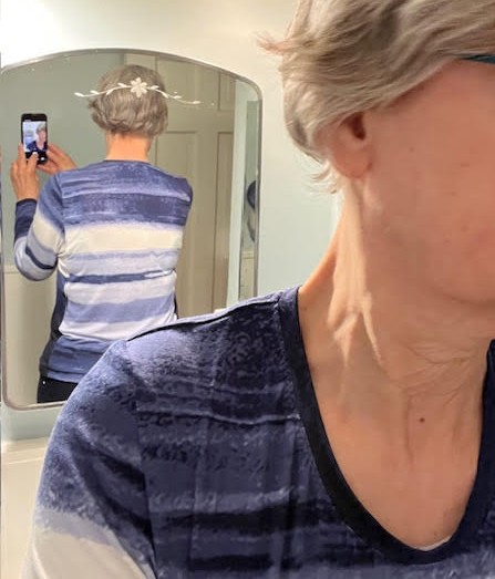 Meet our friend Andi. Andi first emailed Rae in 2020 about trying to get the Tabula Rasa Knit Tee & Tunic pattern to fit her well. She was frustrated and although Rae had sent her suggestions, her life was busy and she had not found knit top success. Fast forward to September 2025 when we led a one-day class for the Maryland ASG on sewing knit tops for which Andi and a friend registered. As you will see in this post, she is good at persevering, and we are pleased that she has given Rae permission to tell you about her journey to a comfortable fit.